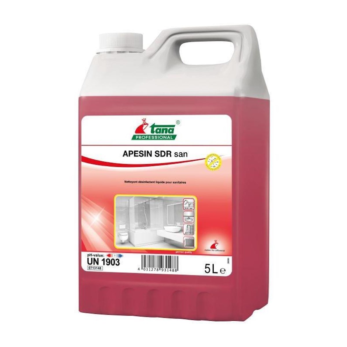 Skumrengøring Apesin 5L med farve og parfume. Surt rengørinsmiddel til rengøring og desinfiktion af sanitære områder. Bakterie- og svampedræbende, samt inaktivering af virus. Rengør og desinficerer overfladen og opløser kalk-belægninger. Perfekt til grundrengøring og daglig rengøring. Regelmæssig brug forhindre udbredelsen af sorte belægninger på fugerne. Efterlader en frisk og behagelig duft.