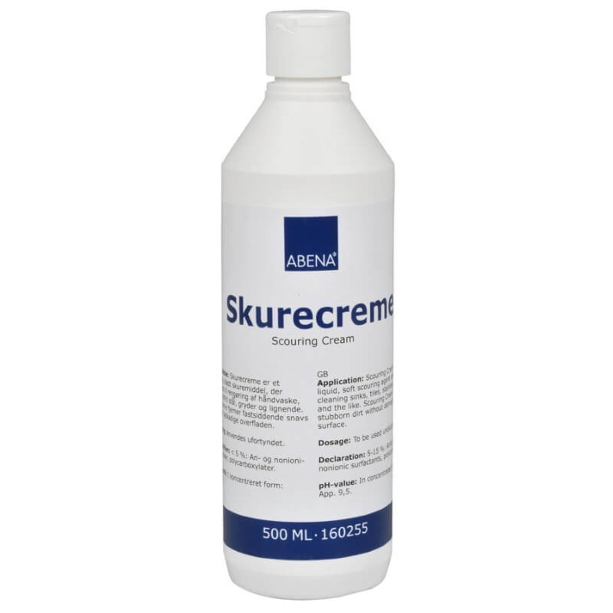 Skurecreme fra Abena. Skurecremen er et flydende, blødt skuremiddel, der fjerner fastsiddende snavs uden at beskadige overfladen. Anvendes til rengøring af keramiske kogeplader, håndvaske, fliser, rustfrit stål, gryder og lignende. Indeholder ikke parfume og farve.
