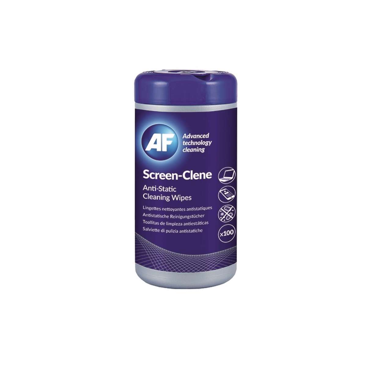 Renseservietter til overflader. AF Screen-Clene Tub. Ikke-brændbare antistatiske vådservietter til rengøring af alle VDU og skærmfiltre. Også egnet til brug på TFT og LCD-skærme og en bred vifte af glasoverflader. Vådservietterne er pakket i praktisk genlukkelig beholder. Alkohol fri og derfor velegnet til skærme, der ikke har godt af alkohol. I praktisk hygiejnisk dispenser-dåse, hvor du nemt trækker en op ad gangen.