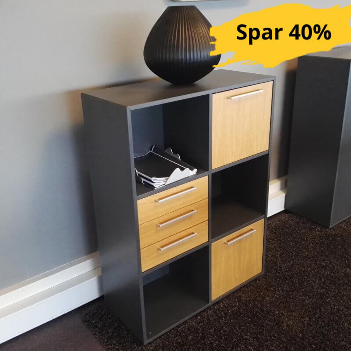 Reol fra Dencon med låger og skuffer til opbevaring på kontoret. Dæmpere på låger og skuffer. Smukt design - solid kvalitet.