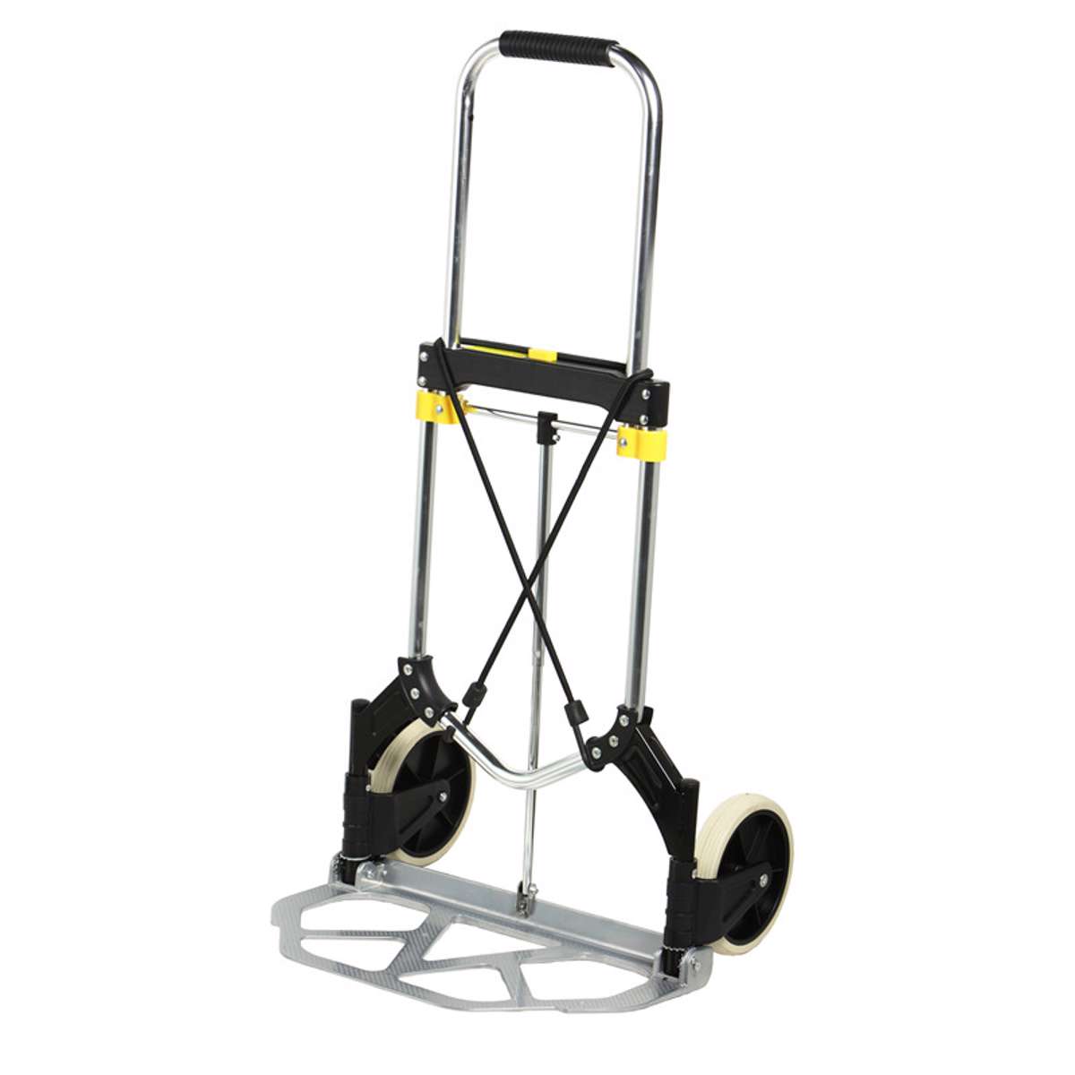 Konstrueret i letvægtsmaterialer aluminium og nylon, sammenklappelig, håndtag med blødt gummi, leveres med elastik, hjul og bæreplade foldes let ud og ind