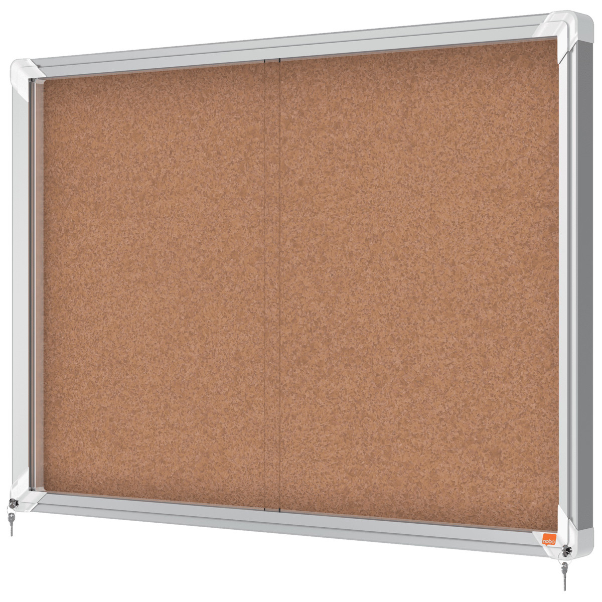 Låsbart opslagsskab i kork, til indendørs brug, med skydelåge og integreret hjørnelås. Komplet med moderne, stilfuld aluminiumsramme og vægmonteres gennem hjørnerne. Opslagstavle med kork overflade til sikkert at sætte dine noter på med kortnåle. Størrelse: 8xA4 ark.