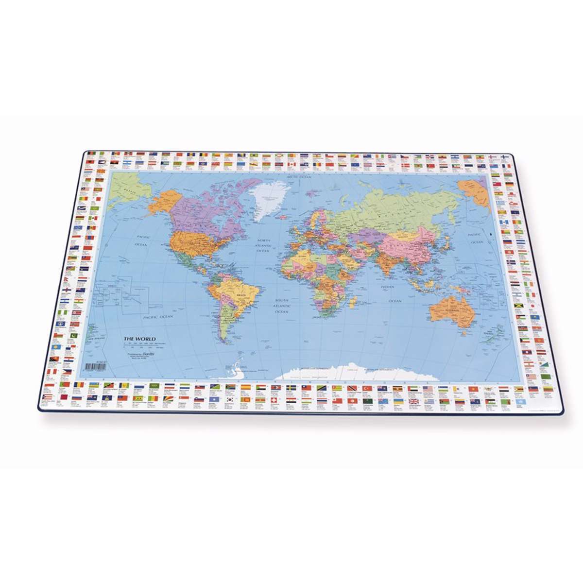Bantex Verdenskort skriveunderlag med to rækker flag rundt i kanten. Flot og nyttigt skrivebordsunderlag til hjemmekontoret eller din arbejdsplads. Foruden et komfortabelt og skridsikkert underlag, der beskytter dit bord, har du hurtig adgang til nyttige informationer og et overblik over Verdens geografi. Dekorativt og praktisk tegneunderlag på samme tid. Sprog: Engelsk/dansk (engelsk på selve verdenskortet og dansk/engelsk på flagene rundt i kanten).