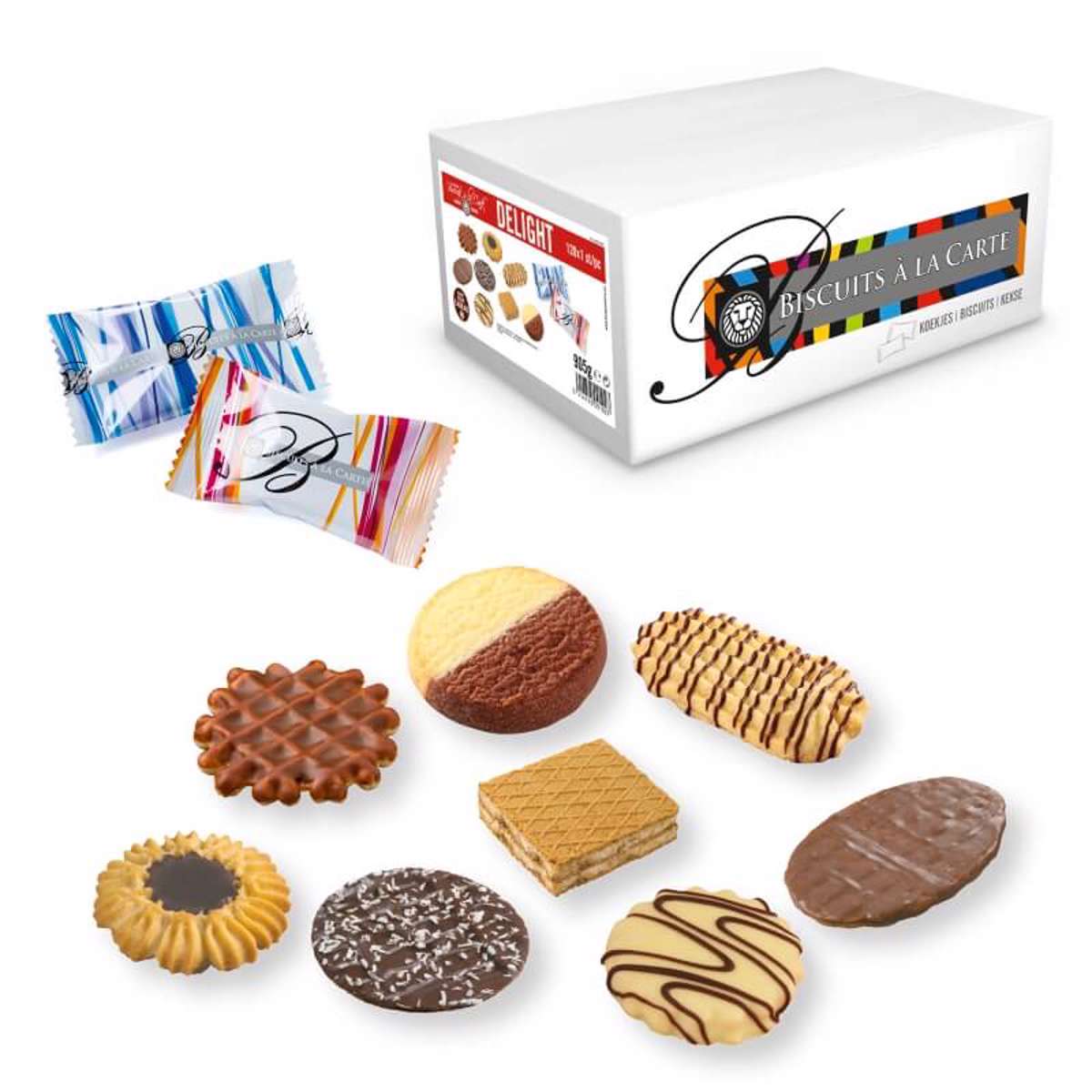 Enkeltindpakkede småkager Delight 120 stk. assorteret 8 slags. Indbydende, hygiejnisk og praktisk enkeltindpakket kaffekage ideel til møde, konference, messe.