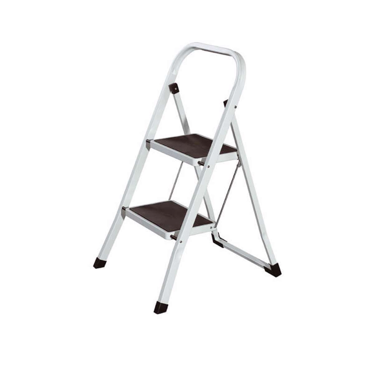 2 trins stål stige med brede trin (380x260mm) med topbøjle. Anti-slip gummi fødder så stigen står sikkert og fast.