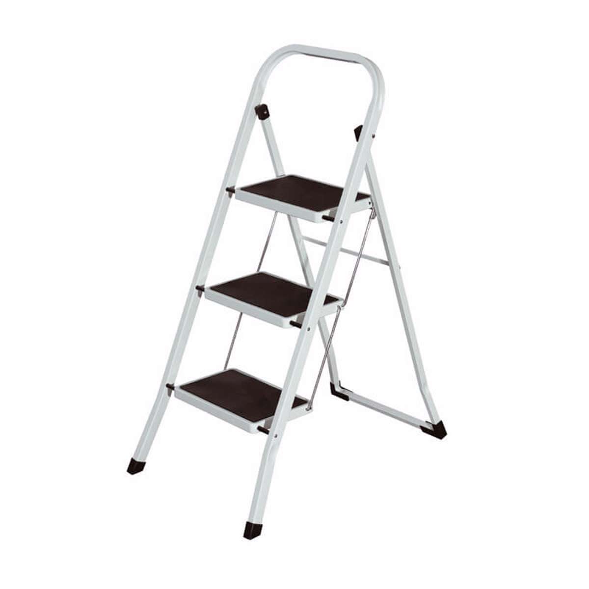 3 trins stål stige med brede trin (380x260mm) med topbøjle. Anti-slip gummi fødder så stigen står sikkert og fast.