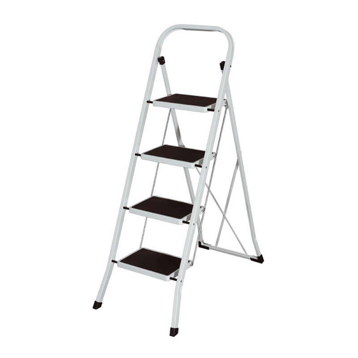 4 trins stål stige med brede trin (380x260mm) med topbøjle. Anti-slip gummi fødder så stigen står sikkert og fast.