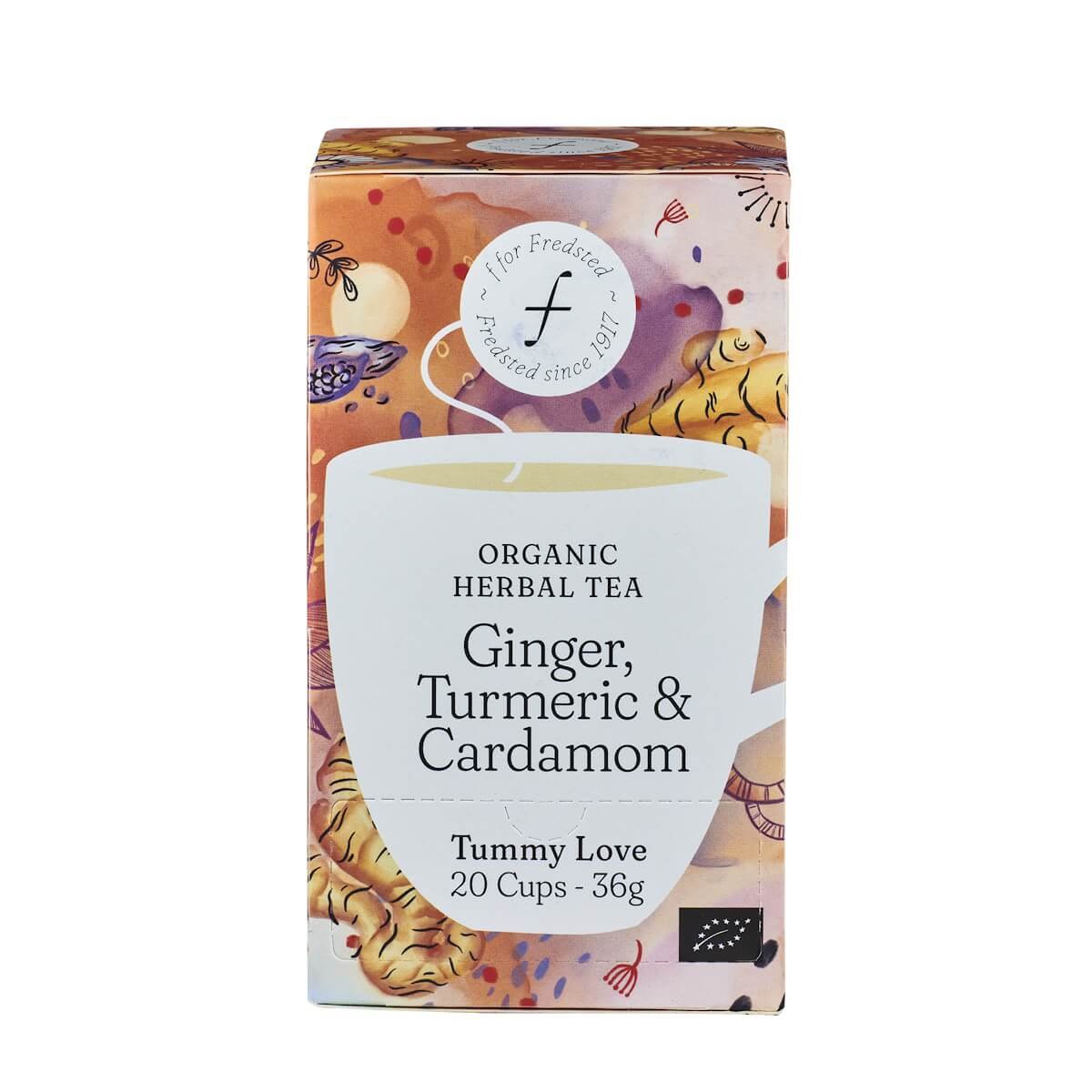 Fredsted økologisk Tummy Love te er en aromatisk økologisk te, der kombinerer ingefær, gurkemeje og kardemomme i en velafbalanceret og krydret smagsoplevelse. Teen har en let sødlig karakter, hvor de varme krydderier giver en rund og behagelig kop urtete, der kan nydes på alle tider af dagen.