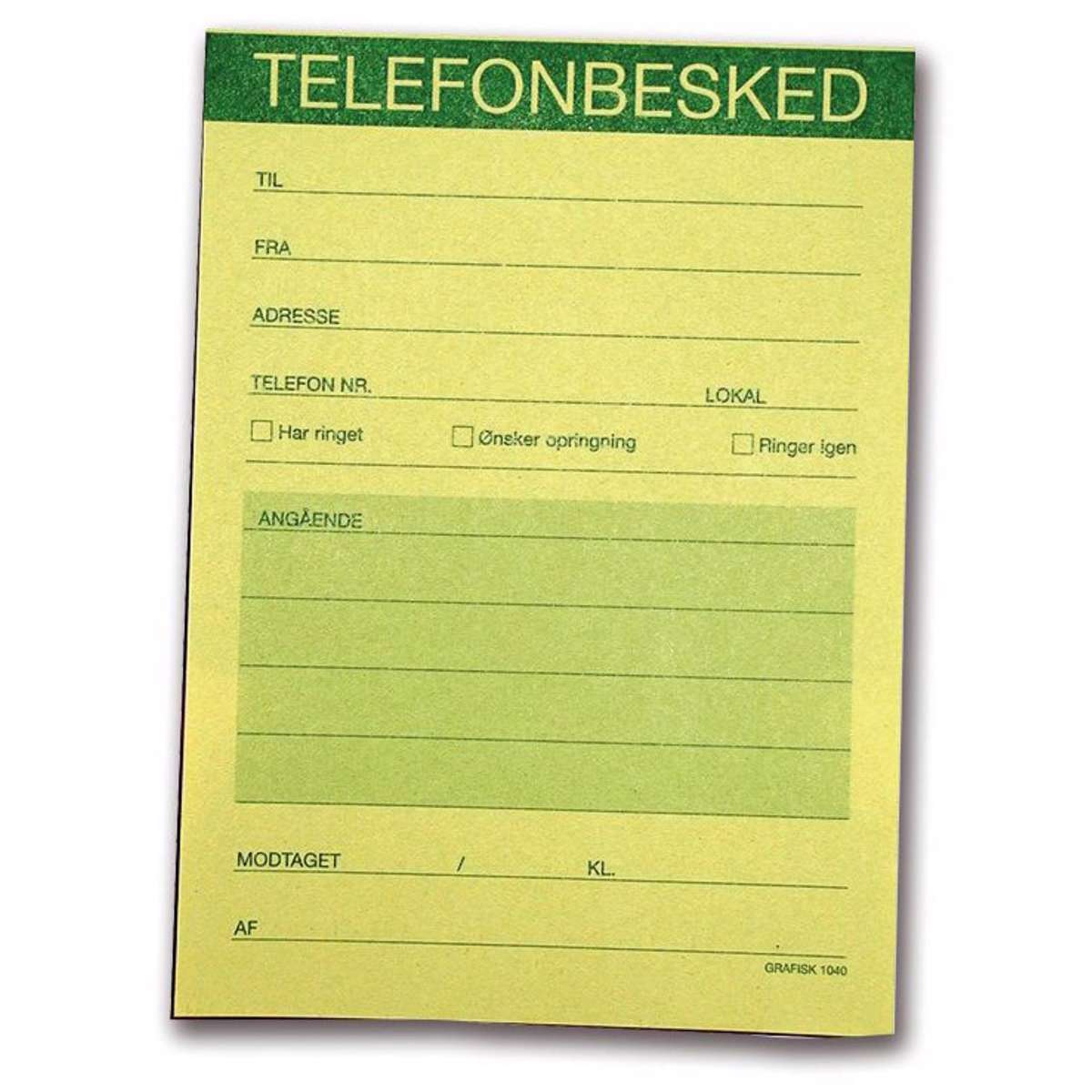 Telefonbeskedblok med fortrykte felter, så du er sikker på at du får noteret alle de vigtige oplysninger fra en telefonbesked. Blokken er nem at udfylde i praktisk lille A6 format. Den har tydelig overskrift "telefonbesked" og i øjenfaldende gul farve, så den vigtige besked ikke forsvinder. 100 blade pr. blok. Fra Grafisk forlag.