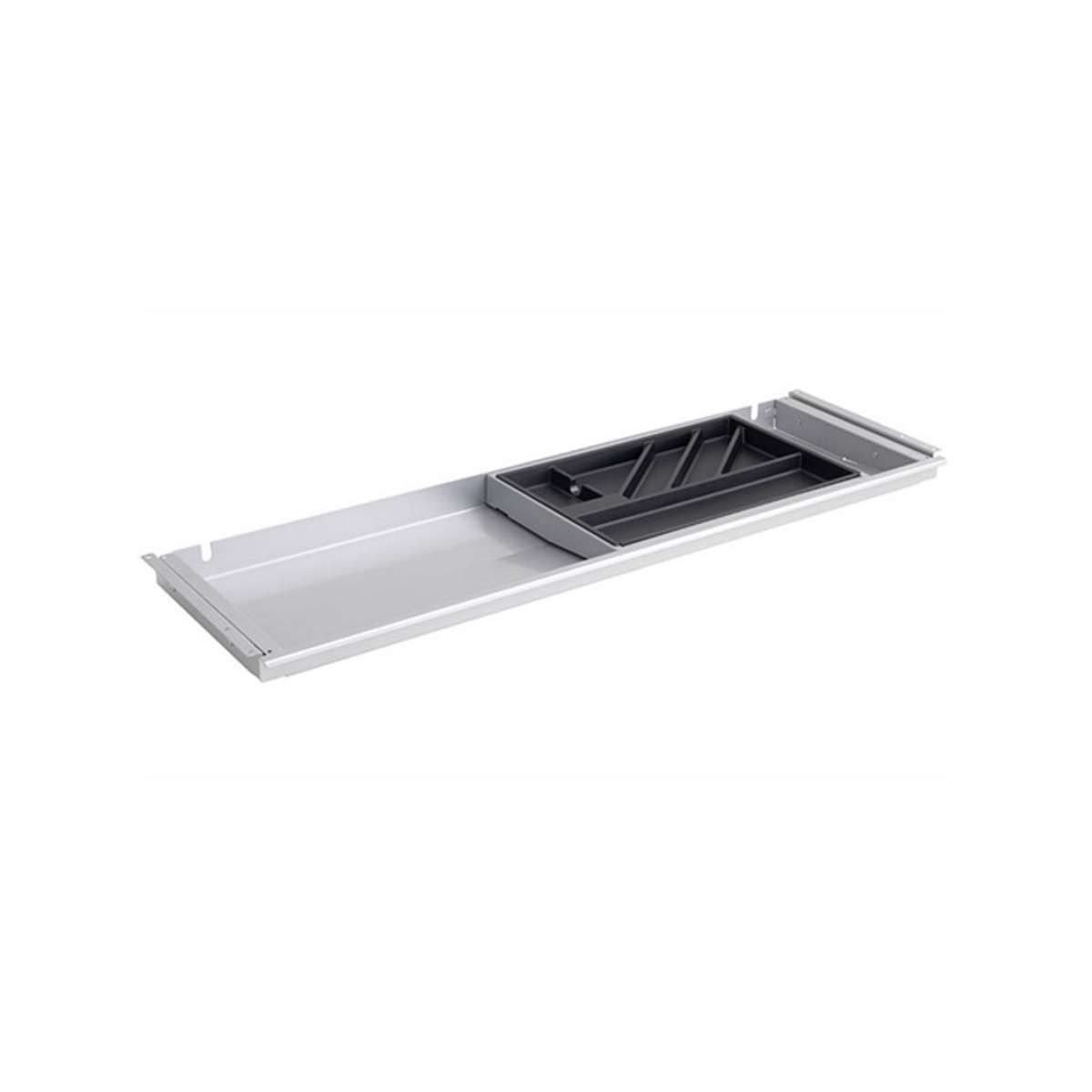 Udtræksskuffe, stor Alu 0094L87,9 x D25,9 x H4,5 cm (L79,8 x D24,4 x H4 cm indvendige mål, hvoraf Plastpennebakke L33,2 x D21,8 x H2 cm og Frirummet L44,3 x 24,8 x H4 cm)