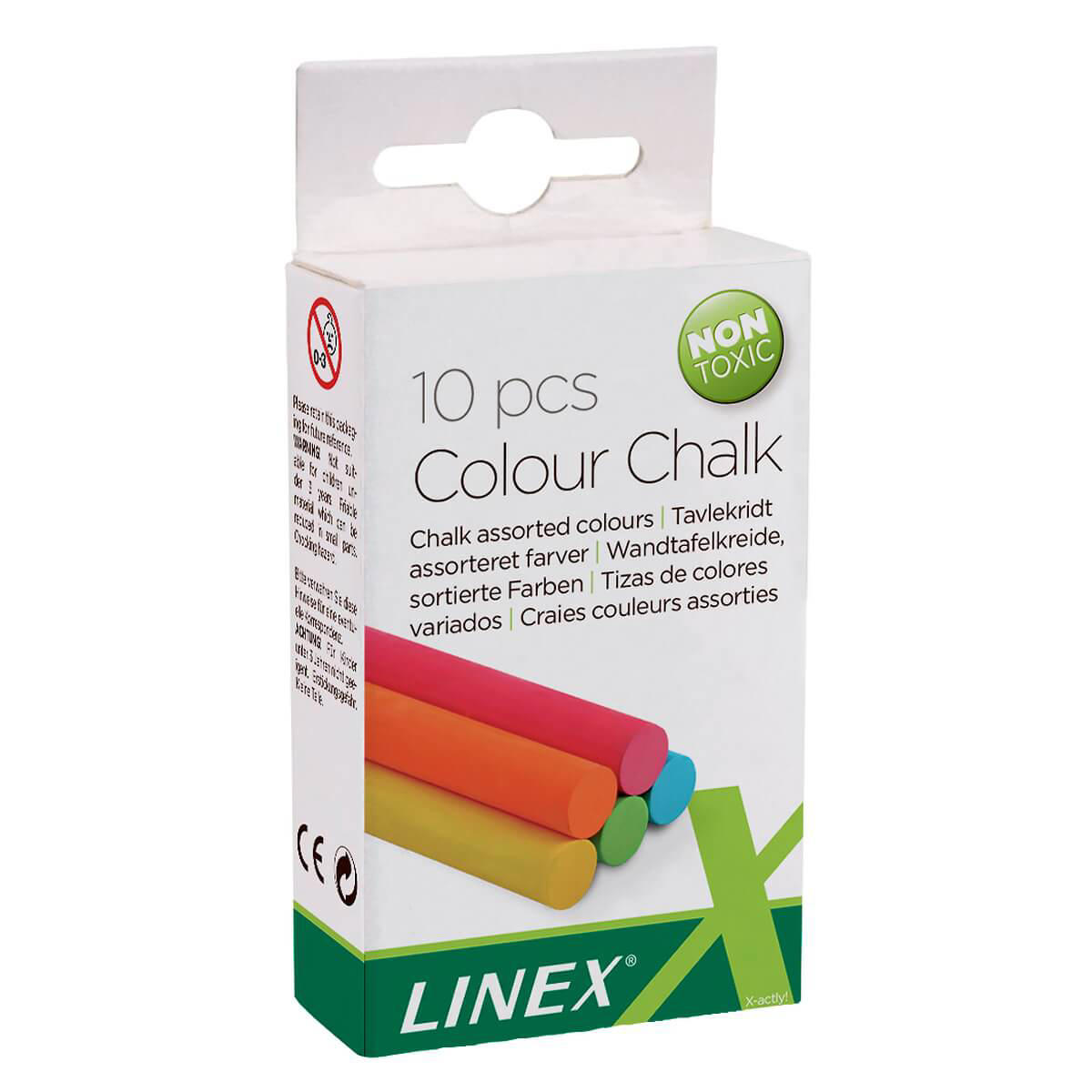 LINEX Professionalisme, præcision og pålidelighed – Linex har siden 1935 lagt ære og erfaring i, at skabe tegne- og måleredskaber i højeste kvalitet. Dansk design, som studerende, kontormedarbejdere og fag-folk kan stole på – lige nøjagtig!. Runde, støvfrie farvede kridt af bedste kvalitet. Produceret i kalciumkarbonat -bløde og behagelige at skrive med og nemme at viske ud. 10 stk. i æske med ophængehul, assorterede farver.