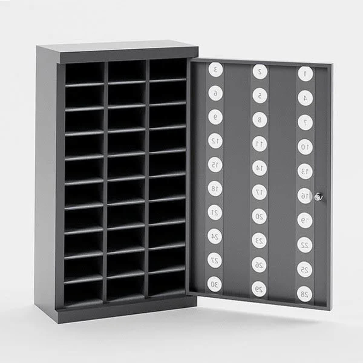 Mobilhotel i robust stål med sikker cylinderlås. Skabet har 30 rum, hver med plads til en mobiltelefon, og filtbelægning i bunden af hvert rum for at beskytte mod stødskader. Rummene er udstyret med plexiglas (Ø40 mm), så der er indsyn til hver hyldeplads, og nummereringen fra 1-30 gør det nemt at holde styr på telefonerne. Skabslågen gør det let for læreren at åbne og få adgang til alle rum på én gang. Skabet er også forberedt til vægmontering for optimal placering.