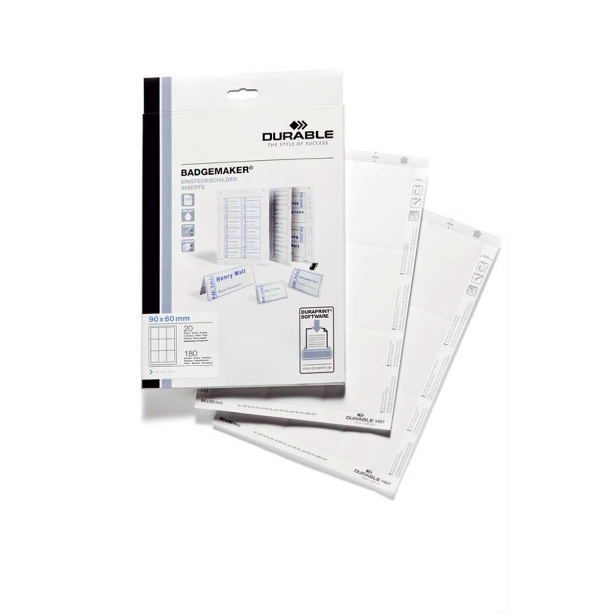 Mikroperforerede PEFC-certificerede indstik på A4-ark. Indeholder 180 indstik i størrelsen 90 x 60 mm. Til professionel udskrivning af navneskilte. BADGEMAKER-indstik til navneskilte kan også benyttes som bordkort. Til DURABLE artikelnr. 8002, 8107