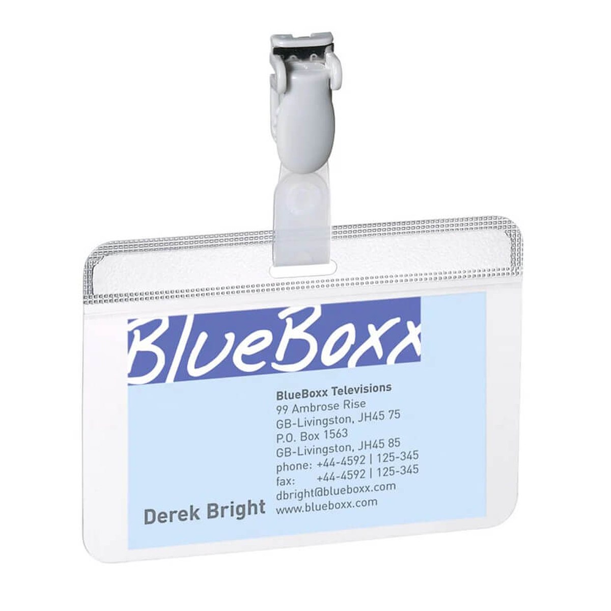 Selvlaminerende navneskilte i tværformat med klemme på strop (seleclips). Navneskiltet hænger altid i den rigtige position fordi plastklemmen er drejelig. For at forsegle, fjern den beskyttende film fra den selvklæbende forside, indsæt visitkortet ved at trykke godt ned. Til visitkort og kort op til 54x90mm (HxB).