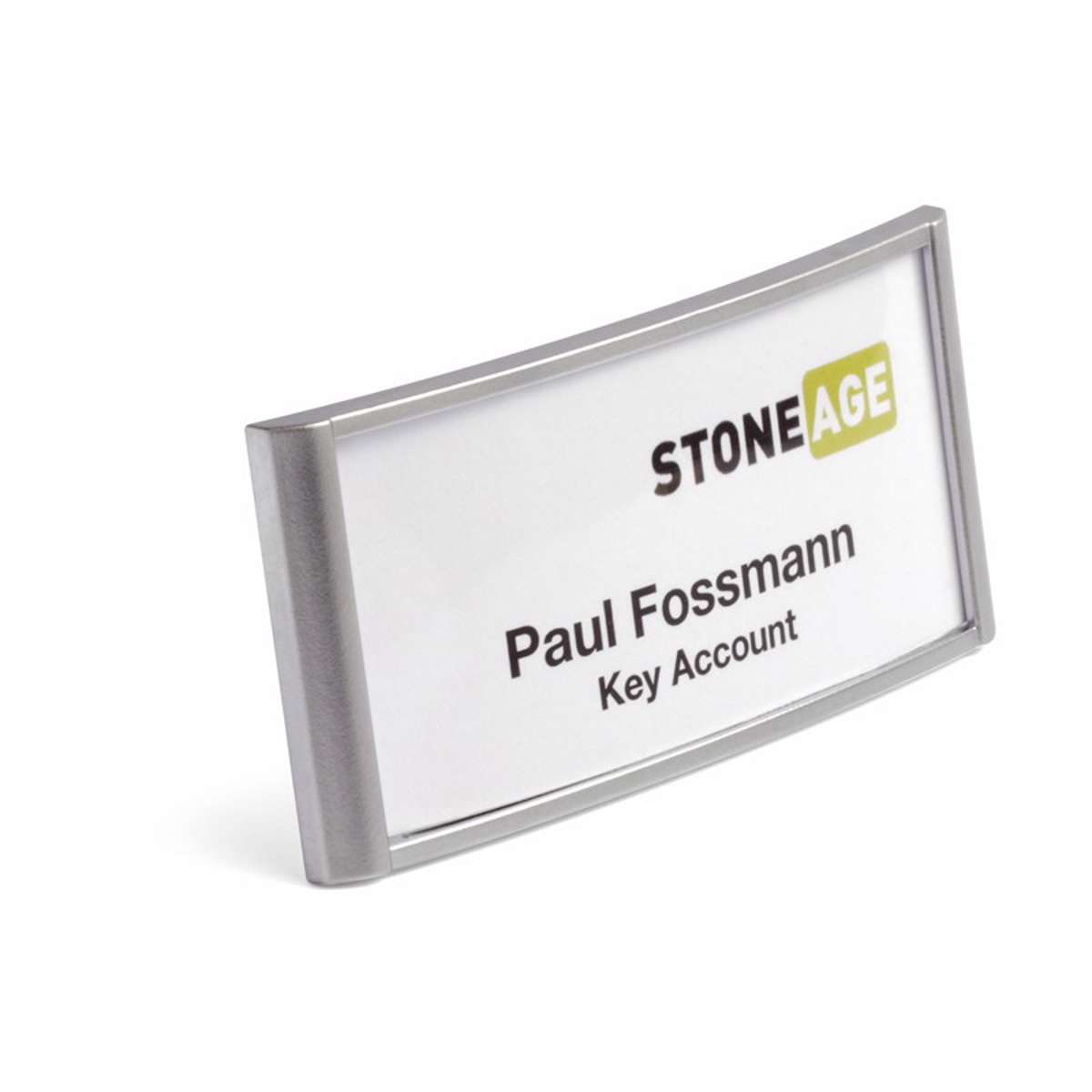 Det klassiske kongresmærke eller navneskilt med galvaniseret sølv finish giver et eksklusivt og professionelt look, og er velegnet til udstillinger, hoteller & restauranter, detailhandel og meget mere. Kongresmærkeholderne kan let genbruges med et nyt kort ved hjælp af flappen på bagsiden. Mærket holdes på plads af to magneter, så det nemt og hurtigt kan sidde på selv det mest sårbare stof og beklædning, og er derfor velegnet til dagligt brug. Design og print professionelle indstik online ved hjælp af det gratis Duraprint® software på durable.eu.