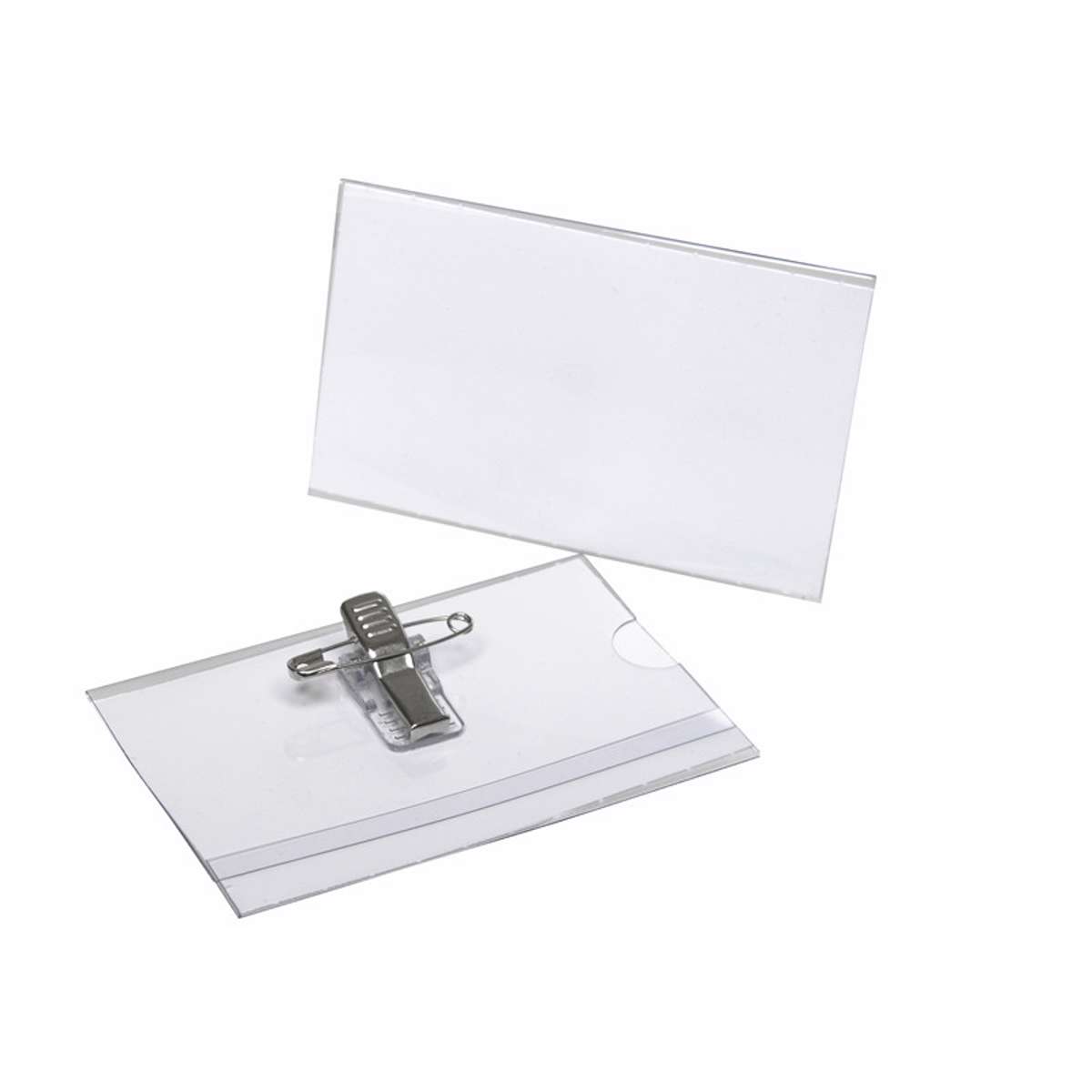 Navneskilte også kaldet kongresmærker i klar plast med sikkerhedsnål og klemme. Navneskilt er med papirindlæg, lige til at printe.