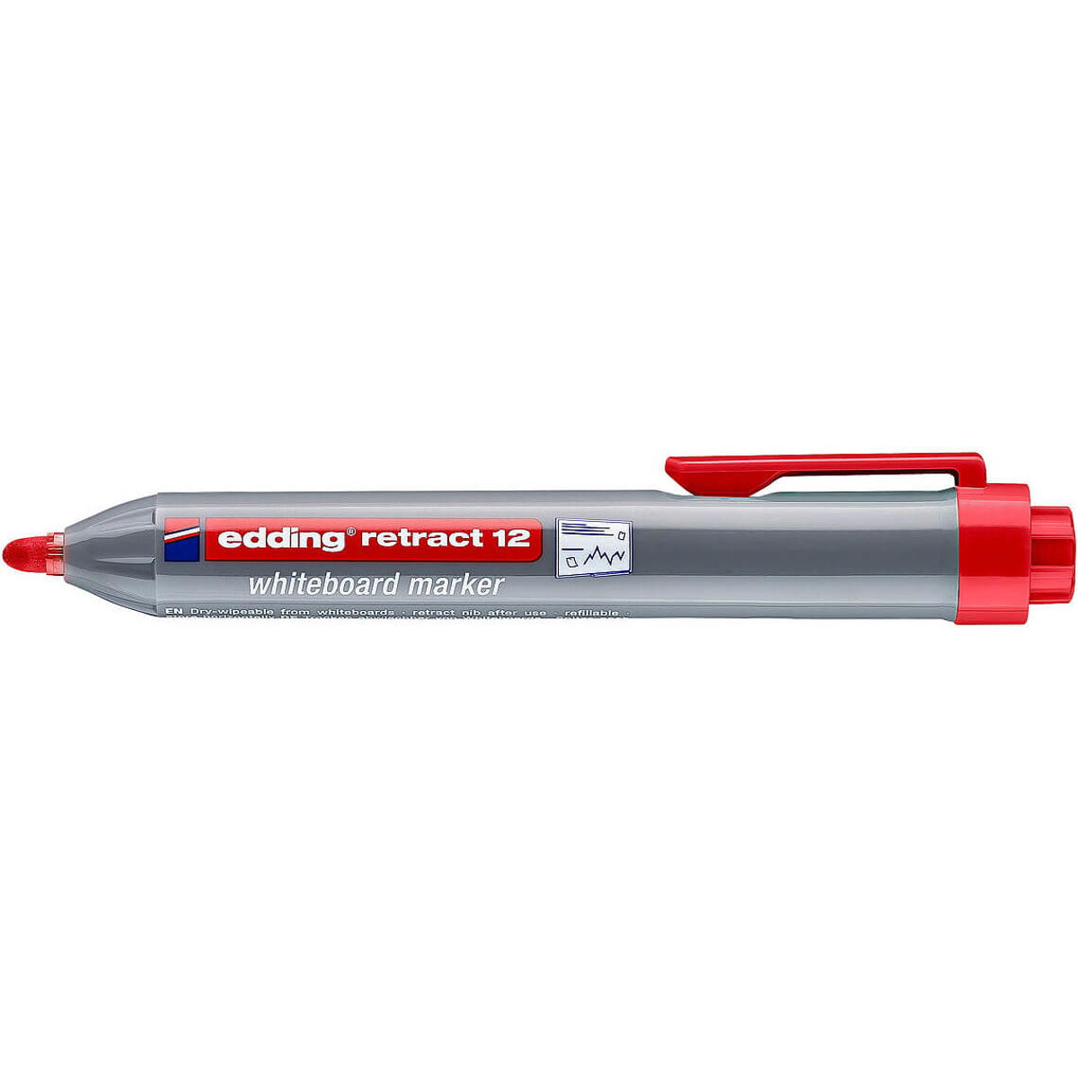 Whiteboard marker med hurtigtørrende pigmentblæk, rundspids og trykknapmekanisme. Spidsen på den hætteløse marker kommer frem efter et tryk på trykmekanismen i enden af markeren, for at få spidsen ind igen skal man blot trykke på den lille knap på clippen eller sætte clippen i lommen, så trækker spidsen sig automatisk tilbage og er beskyttet mod udtørring af et nyt forseglingssystem. En WB marker der lader dig slippe for proppen, og få frie armbevægelser, når du underviser eller præsenterer!