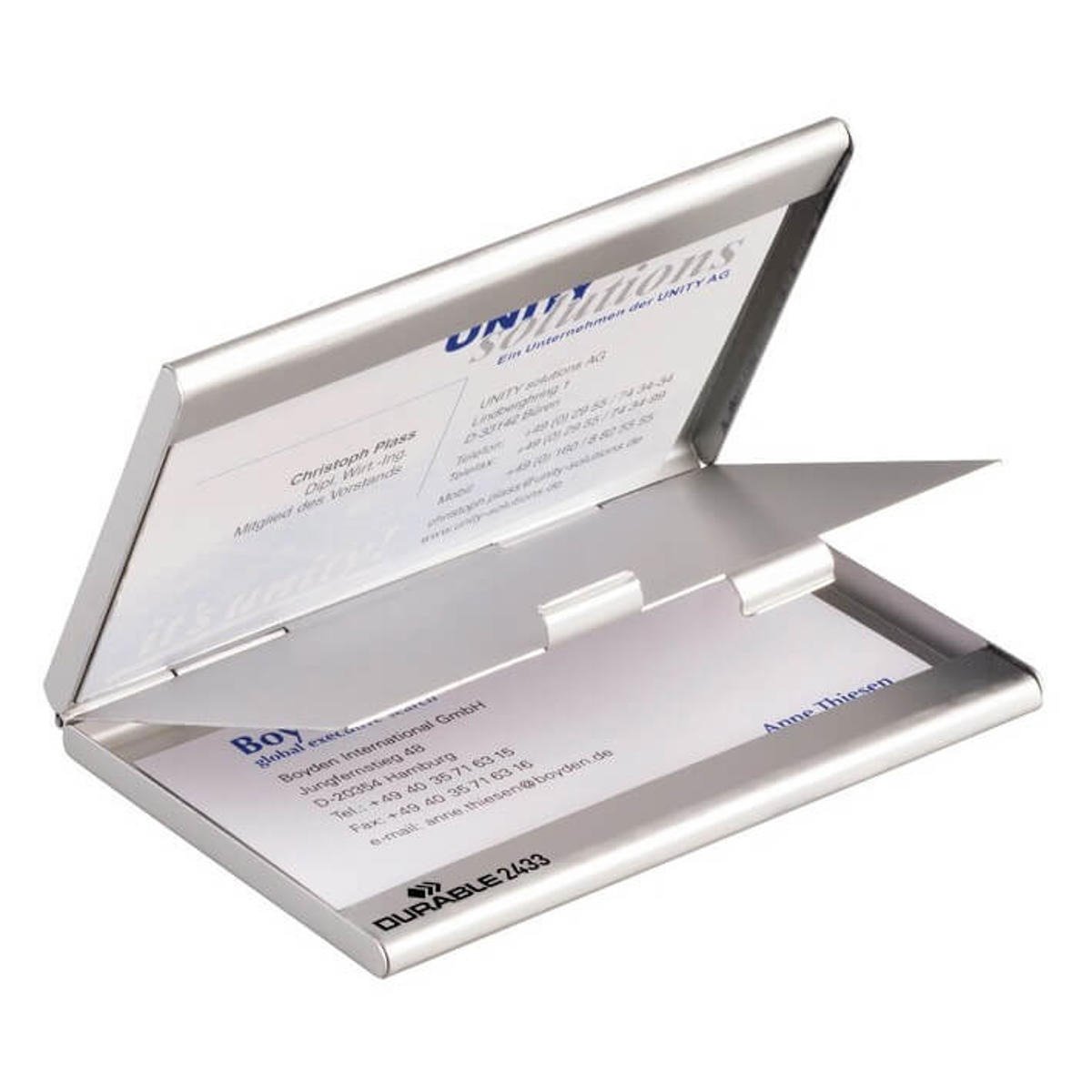Køb Visitkortholder fra Durable med plads til 20 visitkort i aluminium med to rum. Plads til 10 stk. visitkort per rum. Til visitkort i format 90x55mm.