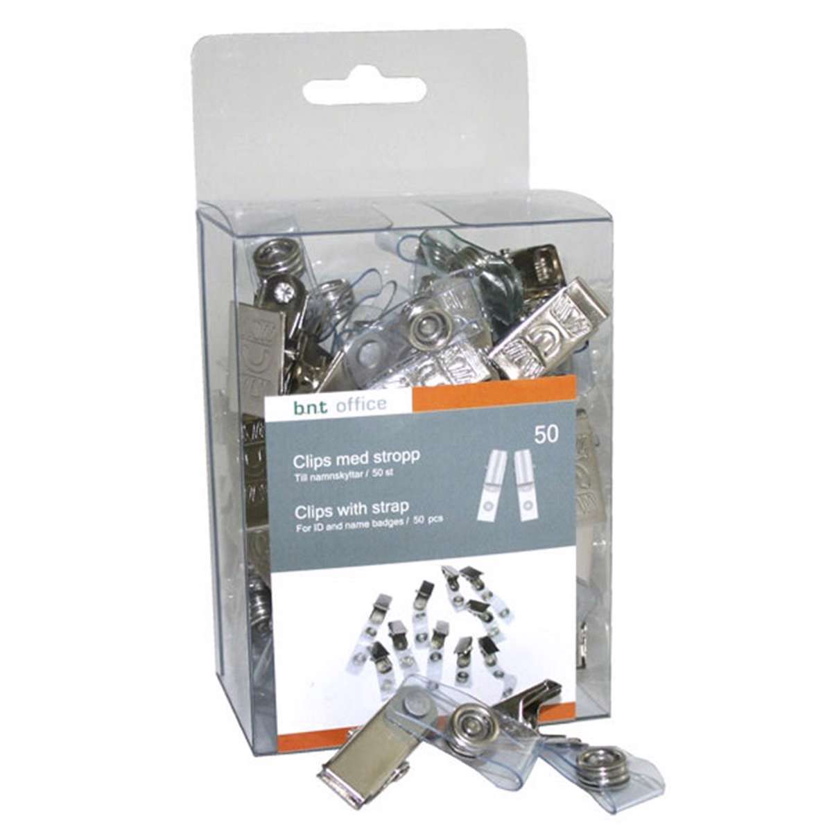 Plastikstrop med drejelig metalklemme, der passer til alle ID-kortholdere, kongresmærker eller navneskilte med strop-hul. Plastikstroppen med klemme gør, at det kan bæres i jakke- eller skjortelomme eller i bukselinning eller -lomme. Dette er praktisk og skånsomt for tøjet, hvis kongresmærket skal bæres synligt men diskret.